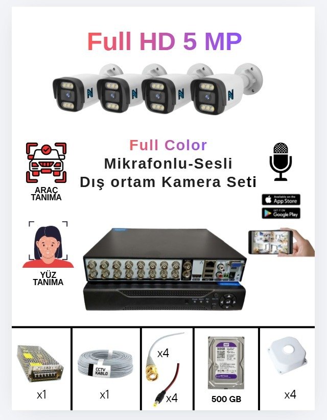 4 Lü Sesli Güvenlik Kamerası 5 Mp Gece Renkli Yüz Ve Araç Tanımalı Full Hd Kamera Sistemi
